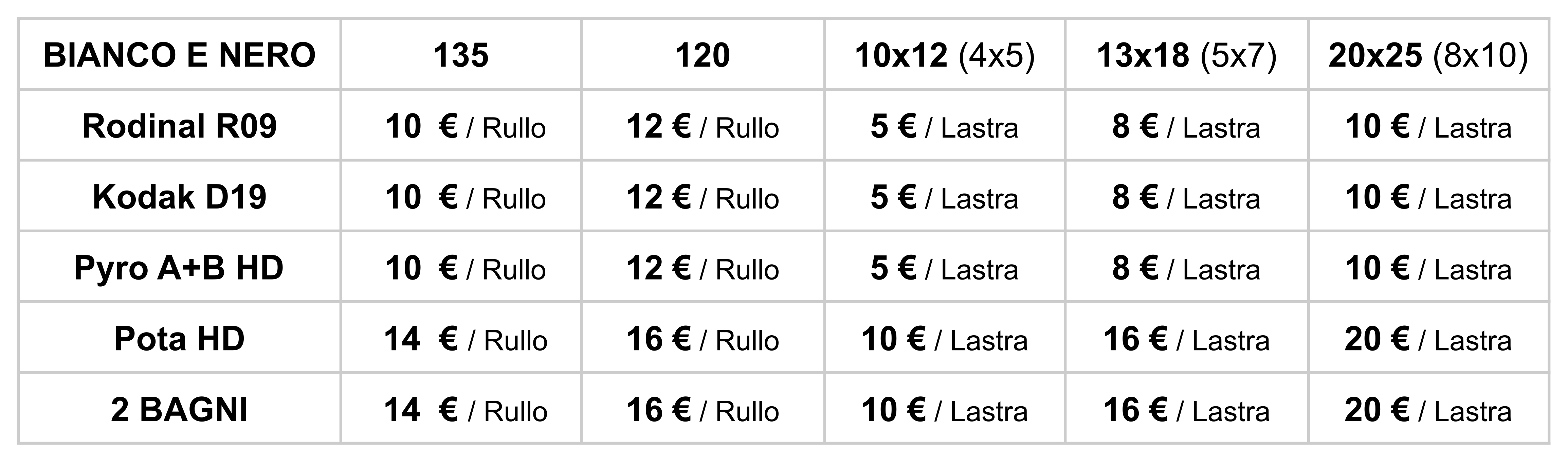 – 2 Bagni: sviluppo a basso contrasto eseguito con 2 bagni separati. Permette di recuperare forti sovra esposizioni e contenere il contrasto. Riduce la grana della pellicola.